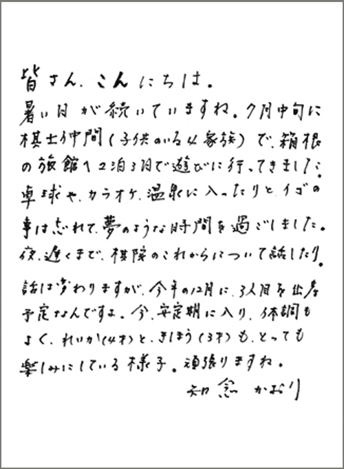 女流棋士の近況報告をご覧いただけます。近況報告では女流棋士のプライベートの写真や近況のお手紙を見ることができます。また抽選で当たる担当棋士からのサイン色紙もご用意しています。応募方法は簡単ですので是非ご応募ください。 続きを読む