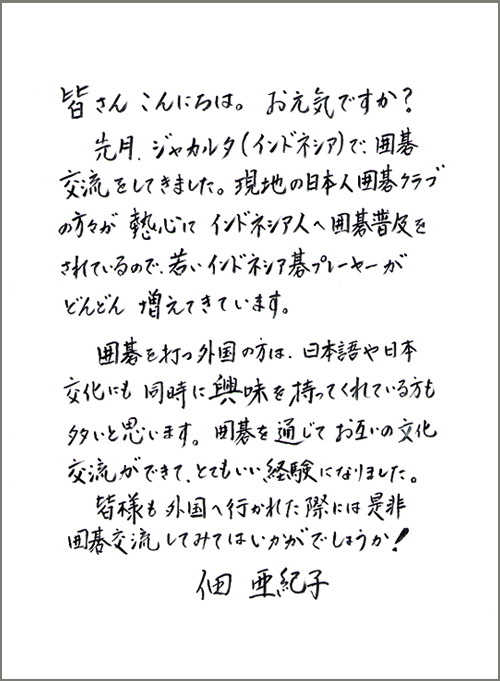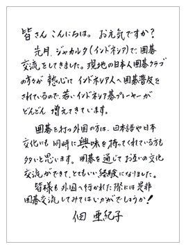 インドネシアで囲碁交流をされてきた佃亜紀子四段の近況写真と直筆のお手紙をご覧になれます。