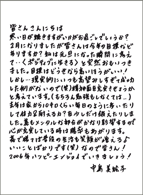 今年の目標はポジティブに生きる!の中島美絵子初段の近況写真と直筆のお手紙をご覧になれます。