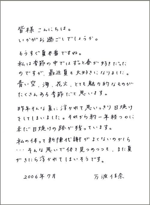 最近は夏が大好きになったという万波佳奈女流棋聖の近況写真と直筆のお手紙をご覧になれます。