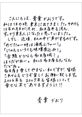 名古屋を愛してやまない青葉かおり四段の近況写真と直筆のお手紙をご覧になれます。