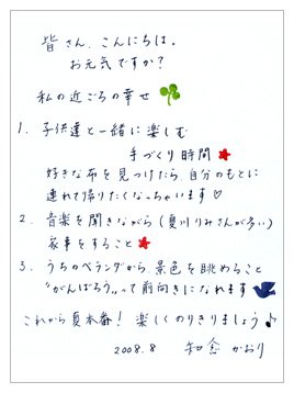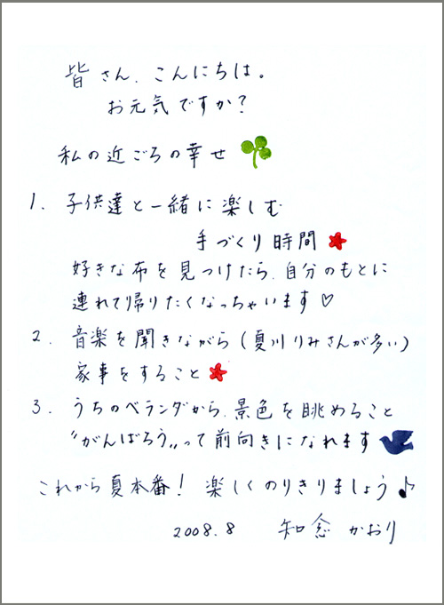近ごろの幸せについて語っていただいた知念かおり四段の近況写真と直筆のお手紙をご覧になれます。
