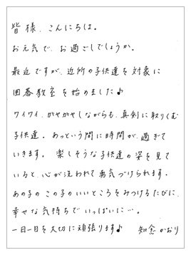 お子様を対象とした囲碁教室を始められた知念かおり四段の近況写真と直筆のお手紙をご覧になれます。