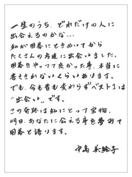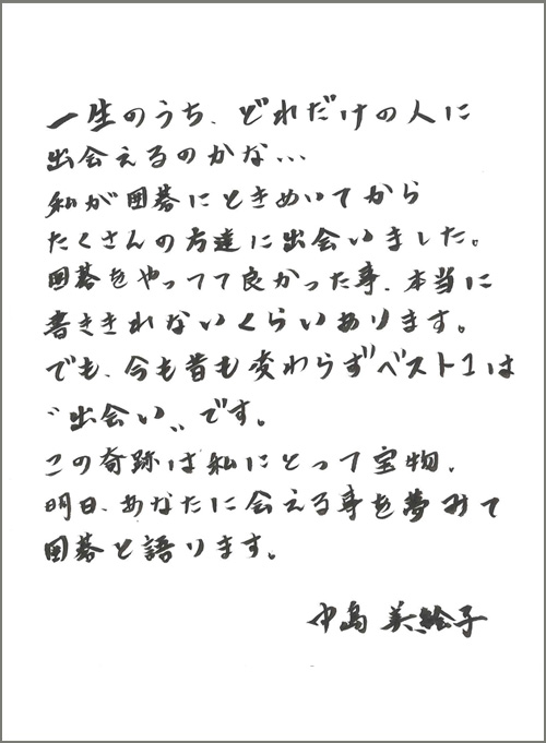 囲碁と出会いについて語っていただいた中島美絵子二段の近況写真と直筆のお手紙をご覧になれます。