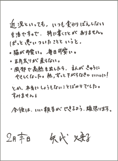 女流棋士の近況報告をご覧いただけます。近況報告では女流棋士のプライベートの写真や近況のお手紙を見ることができます。また抽選で当たる担当棋士からのサイン色紙もご用意しています。応募方法は簡単ですので是非ご応募ください。 続きを読む