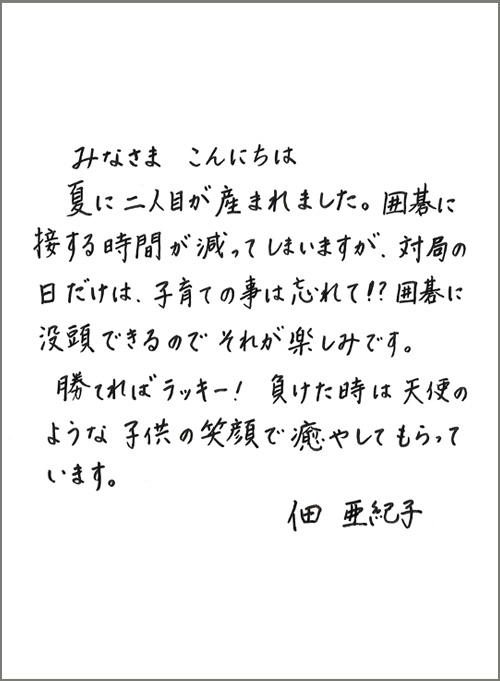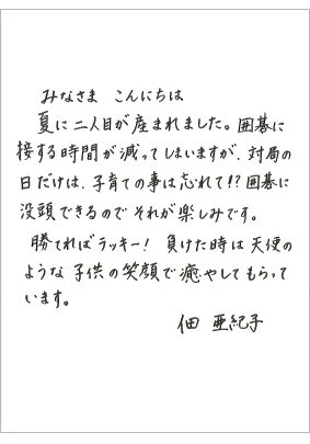 夏に2人目のお子さんをご出産された佃亜紀子五段の近況写真と直筆のお手紙をご覧になれます。