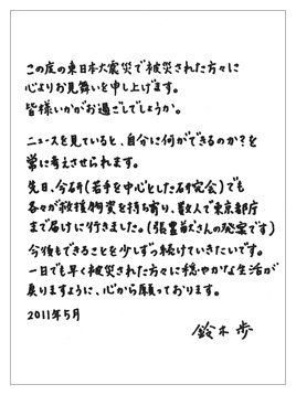 東北関東大震災直後のお気持ちを語ってくださった鈴木歩六段の近況写真と直筆のお手紙がご覧になれます。