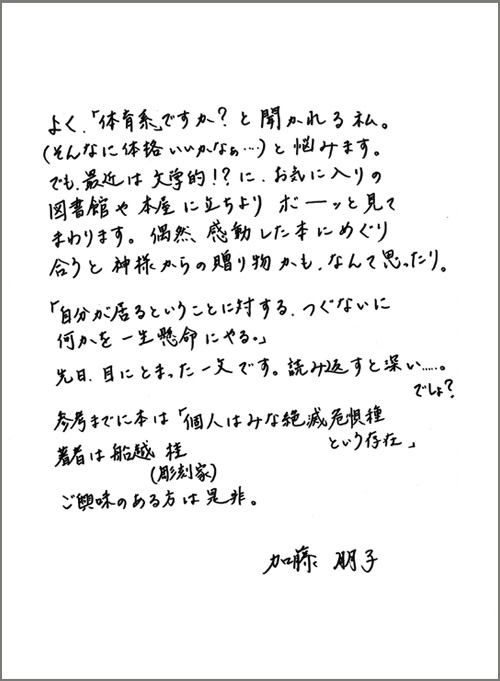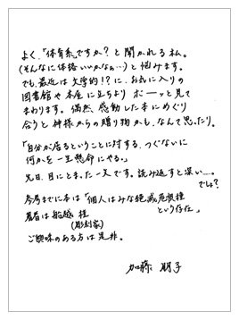 今月はいつもとは違う一面も披露してくださった加藤朋子五段の近況写真と直筆のお手紙がご覧になれます。