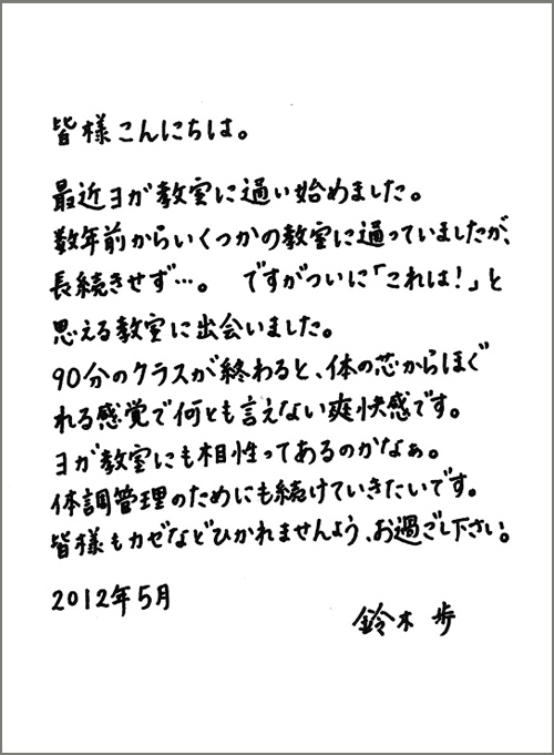 体調管理のためにヨガに通い始めた鈴木歩六段の近況写真と直筆のお手紙がご覧になれます。