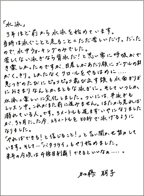 水泳についてたくさん語ってくださった加藤朋子五段の近況写真と直筆のお手紙をご覧になれます。