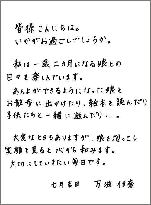 娘さんやご家族との日々を大切にしていらっしゃる万波佳奈四段の近況写真と直筆のお手紙をご覧になれます。