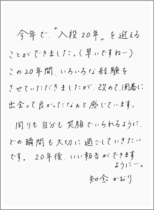 今年で入段20年を迎えた知念かおり四段の近況写真と直筆のお手紙をご覧になれます。