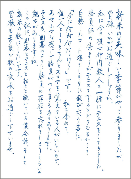 囲碁でもプライベートでもアクティブな大澤奈留美四段の近況写真や直筆お手紙をご覧になれます。