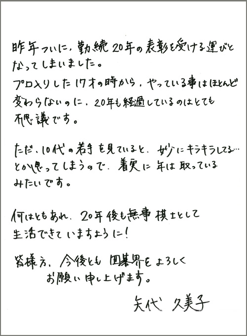 プロ入りして勤続20年となった矢代久美子六段の近況写真や直筆お手紙をご覧いただけます。