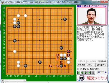 ここで白Aのコスミツケが有力です。勢い黒Bと切り、符号順に白Gまでが定石ですが、下辺の黒のヒラキが甘い手となって白有利です。