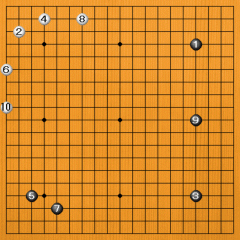 · You could also play as in Dia. 3, but professionals and strong players would never play like this. You'll come to understand the reasons gradually, but let's give some simple reasons. The most unnatural move here is White 4. Places like this on the edge of the board are usually low in value, so they are rarely played at an early stage of the game. Black 9 is also funny. Black has stones at 3 and 7, but linking them up immediately with 9 is inefficient. You may not completely understand the meaning of this yet, but there's no need to worry. You will understand little by little. If you just vaguely remember that 'it's better not to play on the edge at the beginning' and 'lining up stones in a row is inefficient', that's good enough.