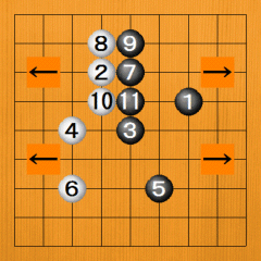 · (Game Example 2) This is another actual game. It has proceeded to move 11. Again, Black looks like getting territory on the right side and White on the left. We hope you can see this. |