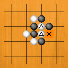 · Dia. 24. In the same position, let's assume that it's the other player's turn to move. What happens if White plays first? The marked black stone is surrounded on three sides by white stones, so its only vacant point is the X point. That means that White can capture the black stone if he plays there. |