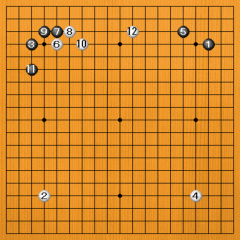 · Black turns the top left into territory with 7 to 11, and White occupies the centre top up to 12. The moves here are a set pattern, but instead of 7 there are various other ways for Black to play. |