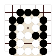 Territory is not created by a single move, but by several moves that create a framework of stones. Efficiently placed stones will create a larger area of influence, and potential territory, than inefficient stones. An extreme example is shown in Diagram 3. The three Black stones surround a single point, while the three White stones are poised to control over half the board. |
