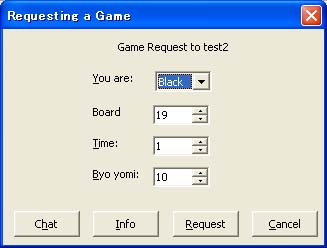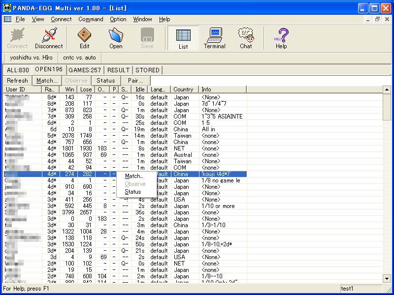 ![]() | When you want to play a game, click [OPEN] tag on the list window. Find the opponent in the open users and select [match] of right-click-menu. |