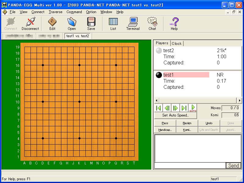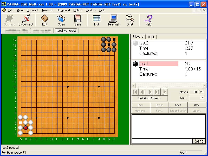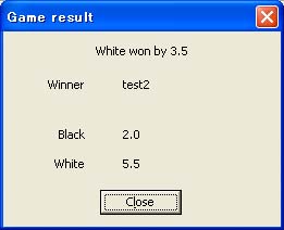 When the opponent accepts your request, the game window show. The turned player clicks the board twice. If you want to resign the game click [Resign] button. The game finishes click [Pass] button. It takes 3 'pass' moves to begin scoring. |