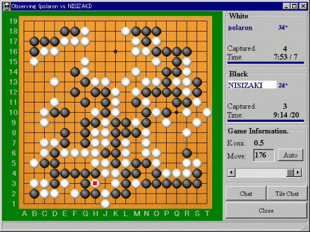 GAMES IN ACTION![]() To observe a game, click on Observe a game. ![]() This is the Observe a game selection. This window lists all the games currently being played. To begin observing a game, double click on any name, or the game number on the left. ![]() The observation window. Information is displayed for both players and the game, such as their rating, number of moves remaining within each player's time period (this example shows that polaron 3d* has 7 minutes and 53 seconds left to make 7 moves), captures, and Komi. Use the horizontal scroll bar to move backward and forward in the game. The player whose turn it is to play is the player that is highlighted, as well as the player whose clock is running. Clicking on the Chat button brings up the Chat window, and clicking on the Tile Chat button reduces the board to three quarters of the screen and puts the Chat window at the bottom. The Auto button gives you several options for speed of play when reviewing the moves. Note that there is a Time line below the clock in each player information box. When a player is low on time, both the clock and this line will change color, and the Time line will run down from right to left. ![]() After the game has ended, the results window will automatically display. |
