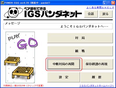 IGSパンダネットに接続後、「中断対局の再開」ボタンをクリックします。 |