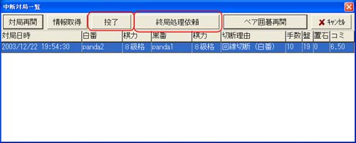 | 2. | 中断対局の一覧画面が表示されます。ここでは両対局者の名前のほかに、対局日時・置石・コミ・中断理由などを 確認することができます。 |