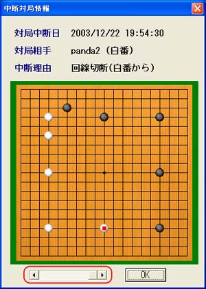 | 画面下のスクロールバーを動かすことにより、中断棋譜を並べることができます。 | |