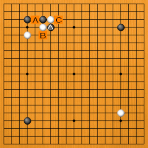黒が△と切ったところです。次の一手を、A~Cの選択肢の中から示してください。