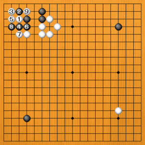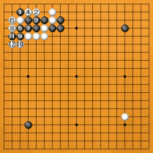 | 定石の選択は、周囲の状況次第です。相手が間違えたら、厳しくとがめましょう。それには、定石の意味を正しく理解していなければなりません。やっぱり、勉強が大切ですね。 |