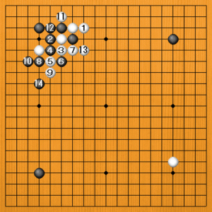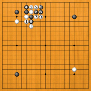 黒3から5とオサえてきますが、ここで白6とハネるのが急所です。黒7の切りが強手ですが、白8、10とアテツいで、微妙な攻め合いの形です。