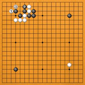白1のツケには黒2とオサえて白二子を取るしかありませんから、白3とハネて隅が大きい。白は厚くて地もあり、働いた姿です。