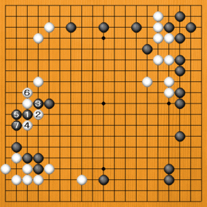 黒1に白2とハネ出されても、怖がることはありません。黒3と切って堂々と戦いましょう。白4とアテて6と引く強硬手段も、黒7とマゲて黒の方が強い姿です。白2と4の二子を動き出すなら、戦いは黒が大いに有利です。