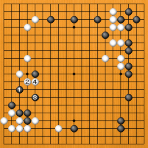 黒1(B)は手堅く生きるスペースを作ろうということでしょうが、白2とコスんで割かれると、黒のサバキが難しくなります。黒3と形を作ろうとしても、白4と押して、ますます黒が苦しくなります。