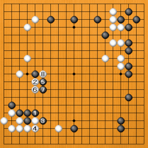 黒1には、白は手を抜いてくるでしょう。白2とツケて黒石を割いて来られると困ります。黒3のアテは利きますが、黒5のハネから7と押しても、白8と切られて後が難解です。