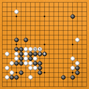 白1、3には、黒4とノビているのが冷静です。やっぱり白5とカケることになりますから、それなら白1、3は保留して、形を決めない方がいいのです。