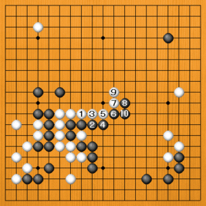 白1(A)の押しは、黒2とノビられて、競り合いに後れを取ります。さらに、白3、5と押すのは、ますます形勢を損なうことになるでしょう。黒6、8の二段バネから10とツガれると、右辺の白の構えも薄く見えてきます。