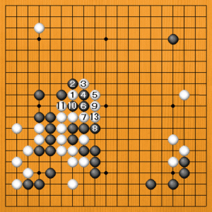 白1、3のツケハネに対して、黒4とアテてくれれば、白5のアテが手筋です。そこで黒6とノビてくれれば、白の理想的な形が見えてきます。白7と出て、9からシボって13とツゲば、黒は形が崩れています。しかし、これは白の勝手読みです。