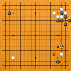 黒が△とハサんだところです。次の一手を、A~Cの選択肢の中から示してください。