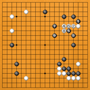 白4と中にトンで逃げるくらいですから、ここで黒5とノゾいて白石を重くします。白石を太らせてから、黒7とボウシしてどんどん攻めていきます。白8のマゲには黒9のトビが厳しくなります。右下の黒の厚い方向へ白石を追い込んで、黒の攻めが調子に乗ってきました。