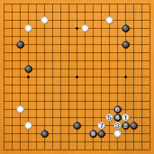 白1に黒2とツメてくれば、それから白3とカケるのがぴったりです。黒4、6とハッて8まで治まるくらいですから、黒を隅にへこませたことで白は満足できます。次に白9のボウシがいいところになります。黒石の多いところで、これだけ頑張れば十分です。