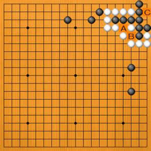 隅の黒が危険です。次の一手を、A~Cの選択肢の中から示してください。