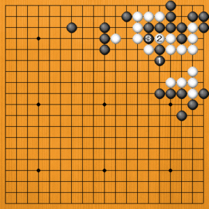 白が手を入れなければ、黒1と逃げだして事件です。白2と出ても黒3とさえぎって、ただでは済みません。
