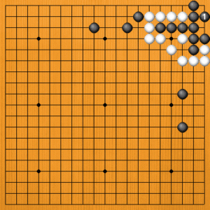 隅の黒に眼がありませんから、黒1(B)と生きるのは素直な手ですが、この場合は失敗です。生きる前に一仕事したかったのです。