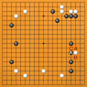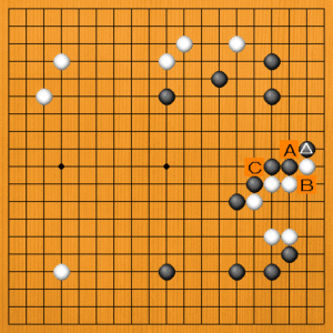 黒△にツケたところです。次の一手を、A~Cの選択肢の中から示してください。