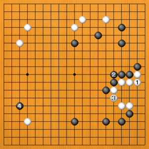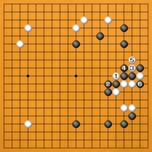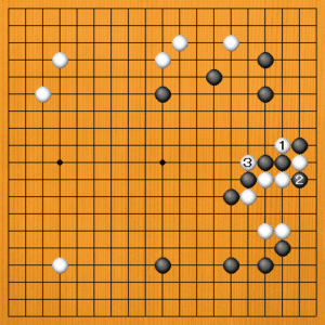 白1の後は3とツグしかありせんが、黒4とカケツがれて何事も起こりません。白5の引きが必要ですから、こうなると、白1と黒2の交換が悪手です。黒6あたりに先着されて、黒が有望な局面になりました。