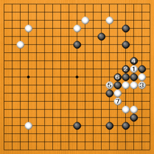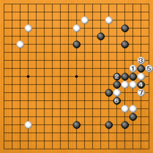 白1には黒2とアテるのが最善ですが、白3のツギが利きます。白5のアテから7と引けば白成功です。白1の切りが働きました。