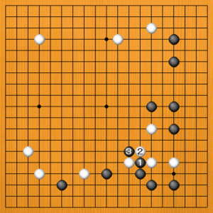 黒1から3とこっちを切るのも有力です。白4のアテから6と出て行くくらいですが、黒11まで応じて、右下の黒地が大きくなります。これも黒成功です。